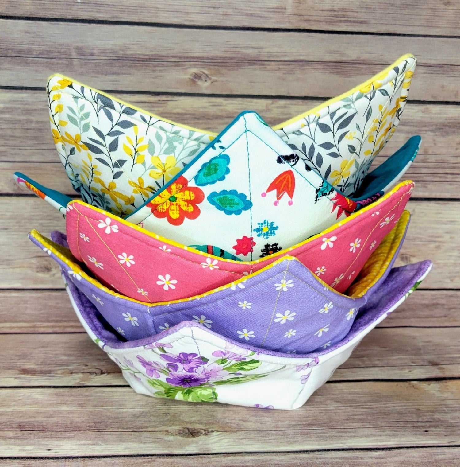 A bowl cozy is made from two layers of cotton batting on the inside, and two layers of decorative cotton woven or flannel prints on the outside. All materials, including thread, is 100% cotton making these cozies safe for using in the microwave.